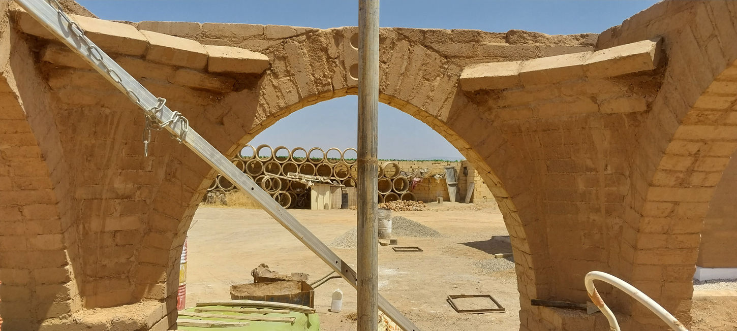 Cette coupole de 3 x 3 m a été réalisée en parallèle à un projet de mise en place d'une production de BTC (Blocs de Terre Comprimé) dans l'usine SABTA à Bezzaza, près de Beni Mellal.